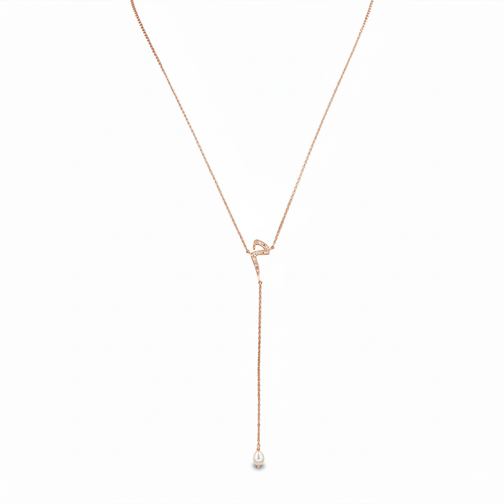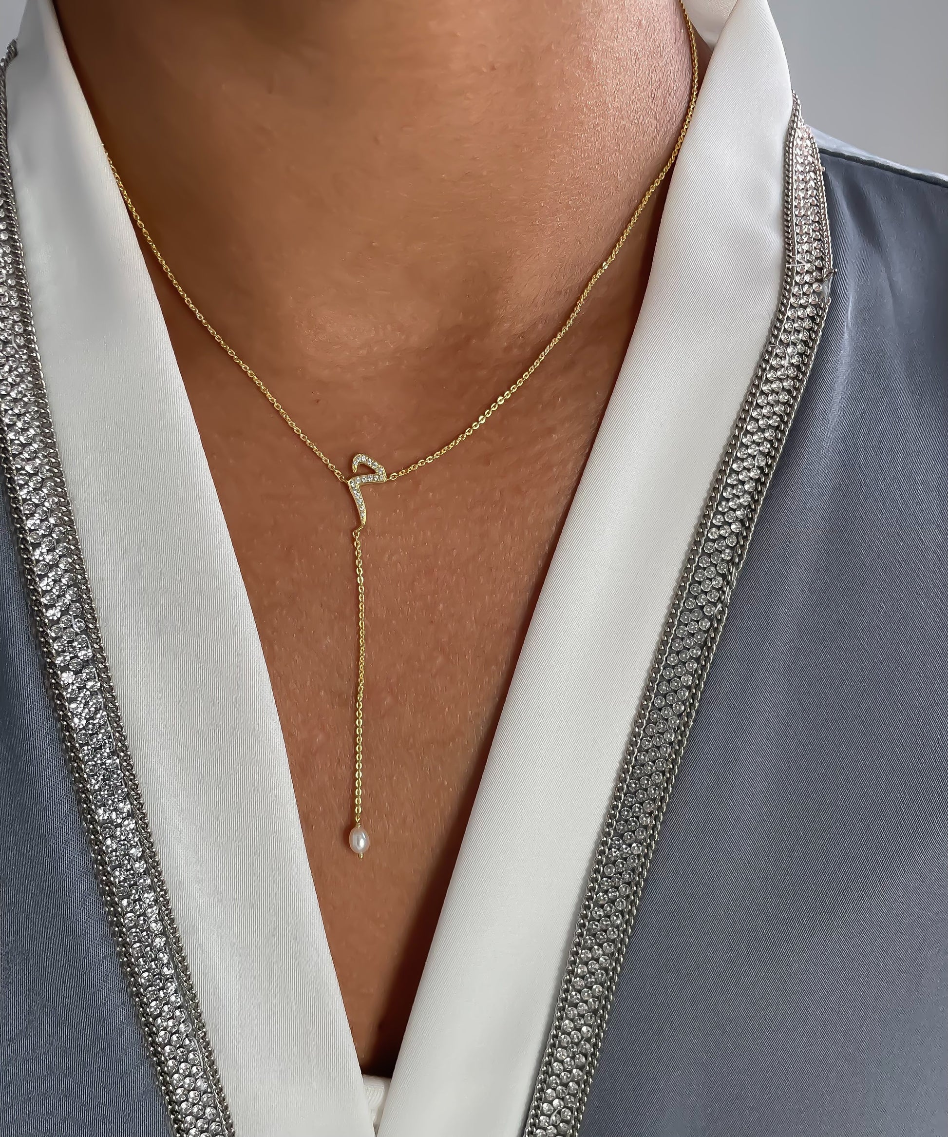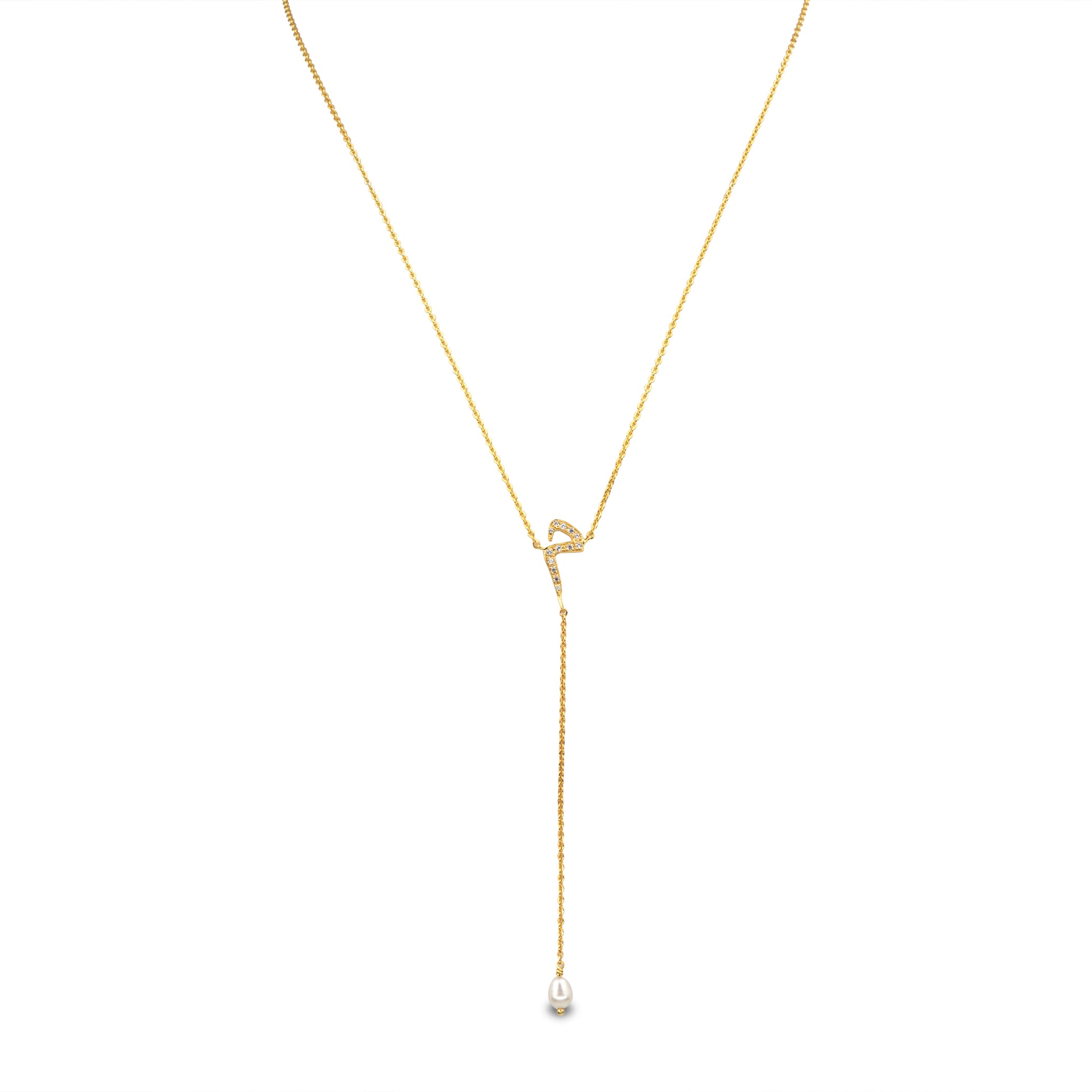 Sparkly necklace with customizable letter and water pearl pendant feature available in gold 18k with diamonds or plated gold with zircons.