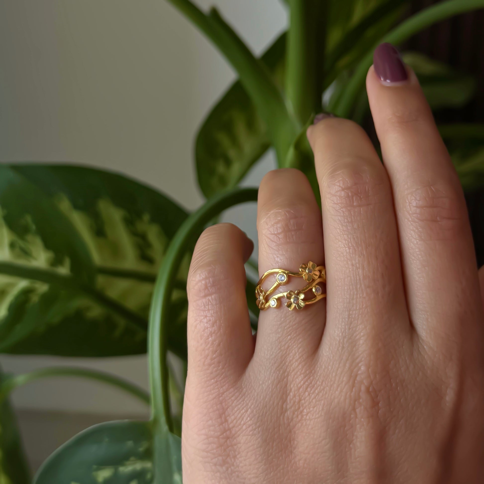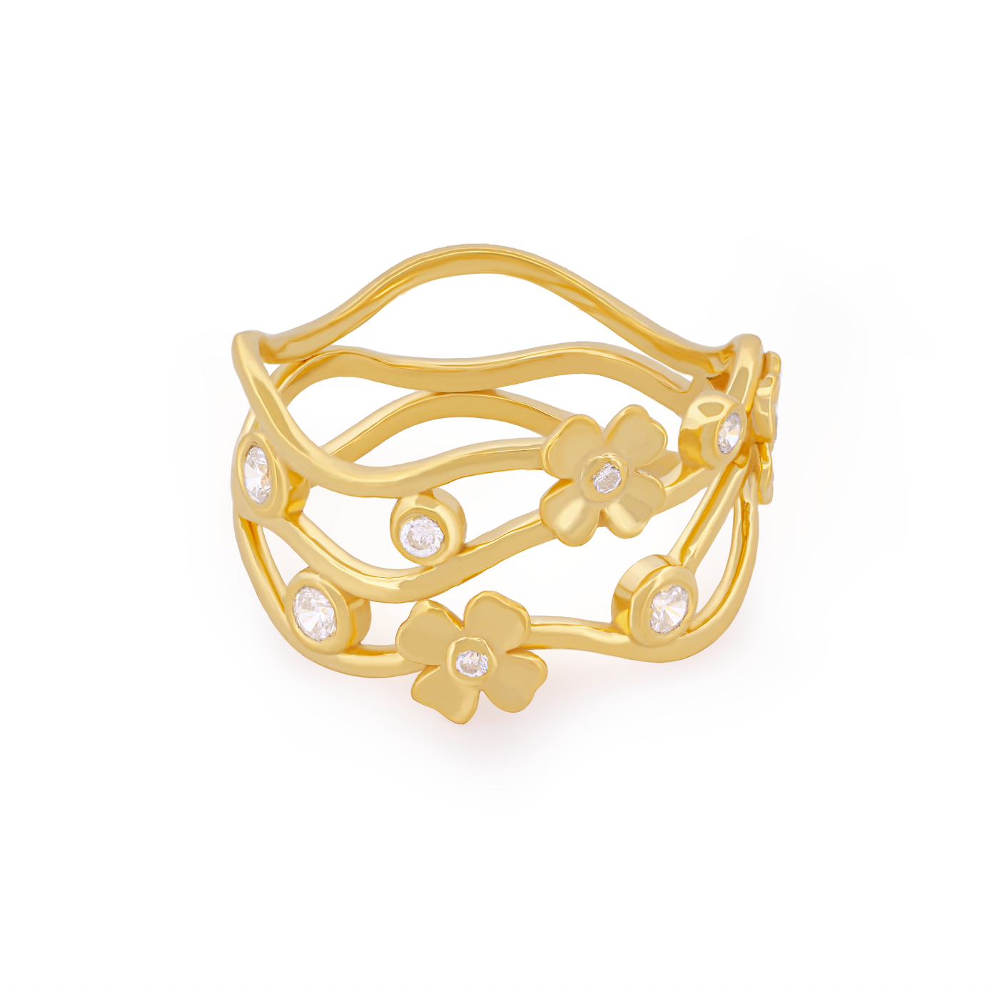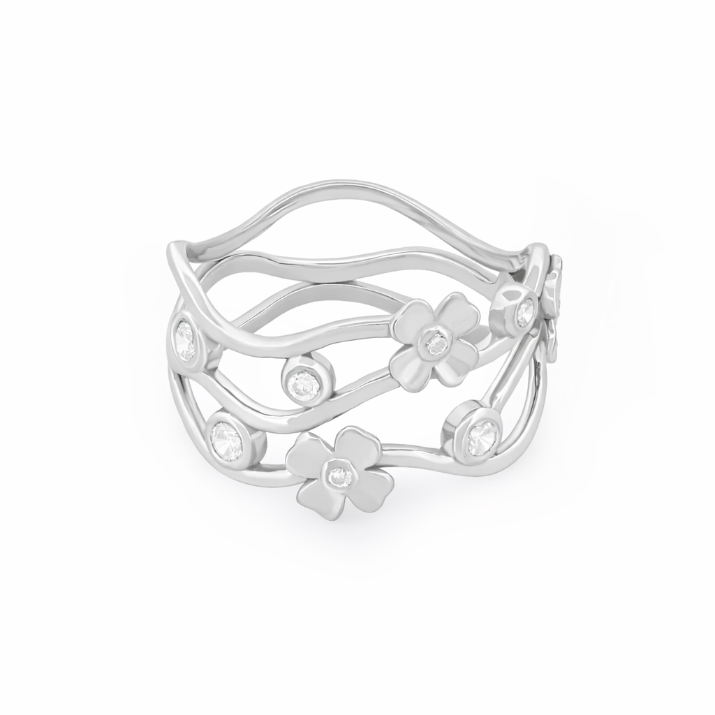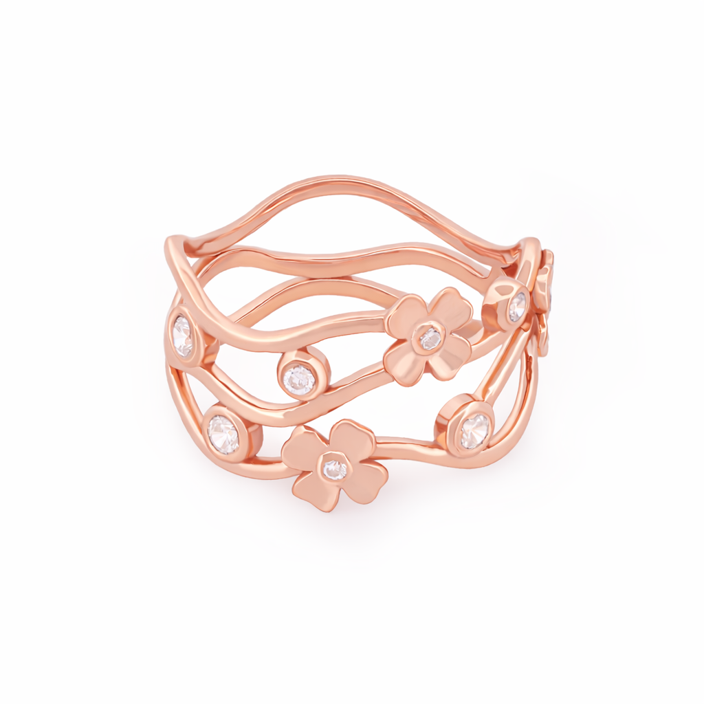 A unique ring featuring flowing gold lines accented with mini floral motifs and sparkling stones. Light, feminine, and perfect for everyday elegance.